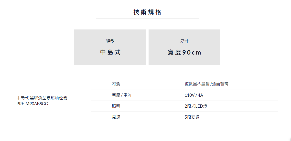 PRE 中島式 黑曜弧型玻璃排油煙機 (90cm)