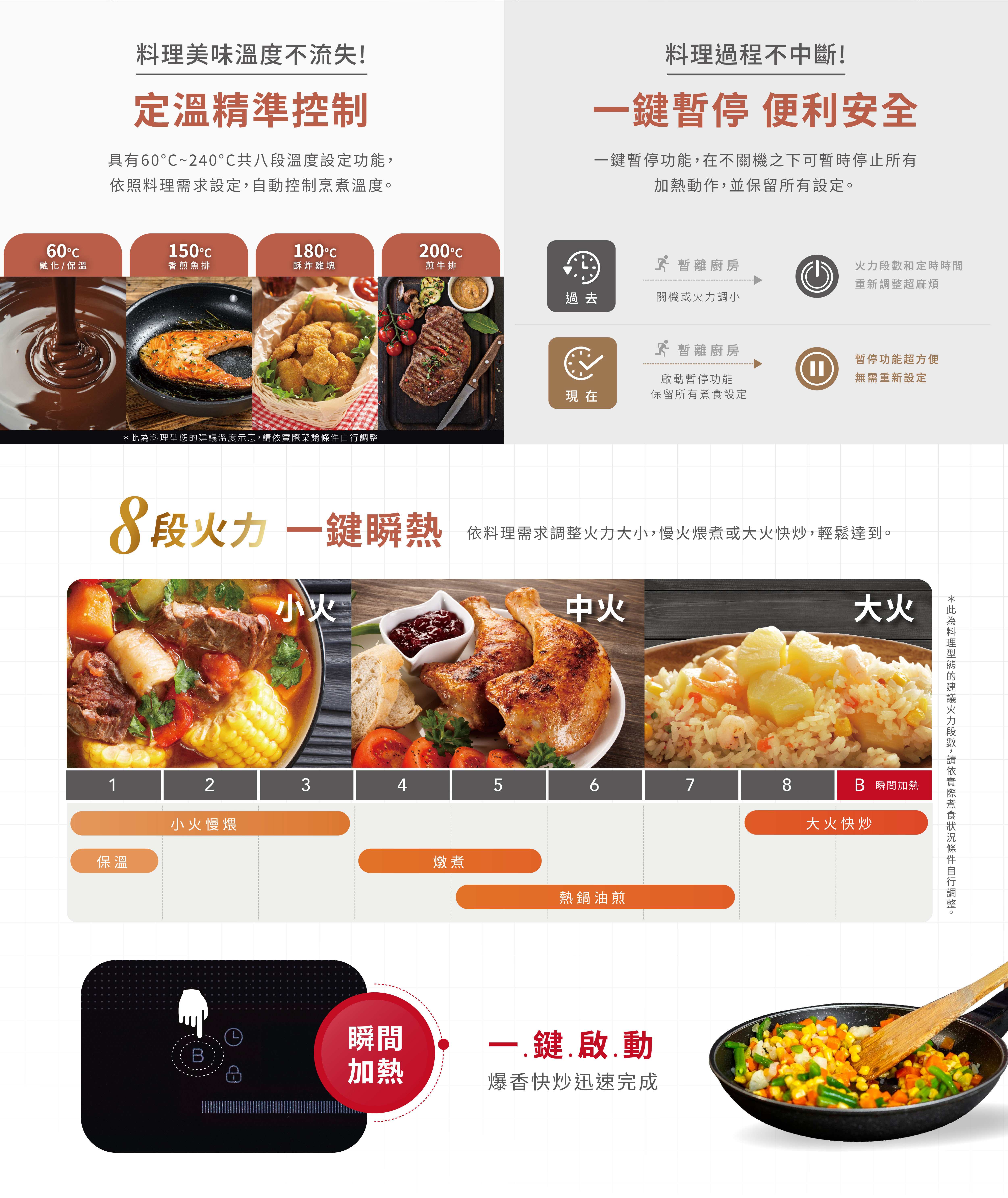 一鍵暫停功能,在不關機之下可暫時停止所有加熱動作,並保留所有設定