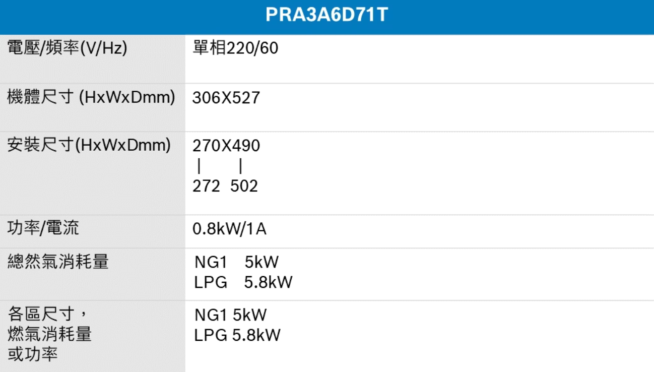 PRA3A6D71T 上裝式 單口瓦斯爐 (30公分/拼爐)