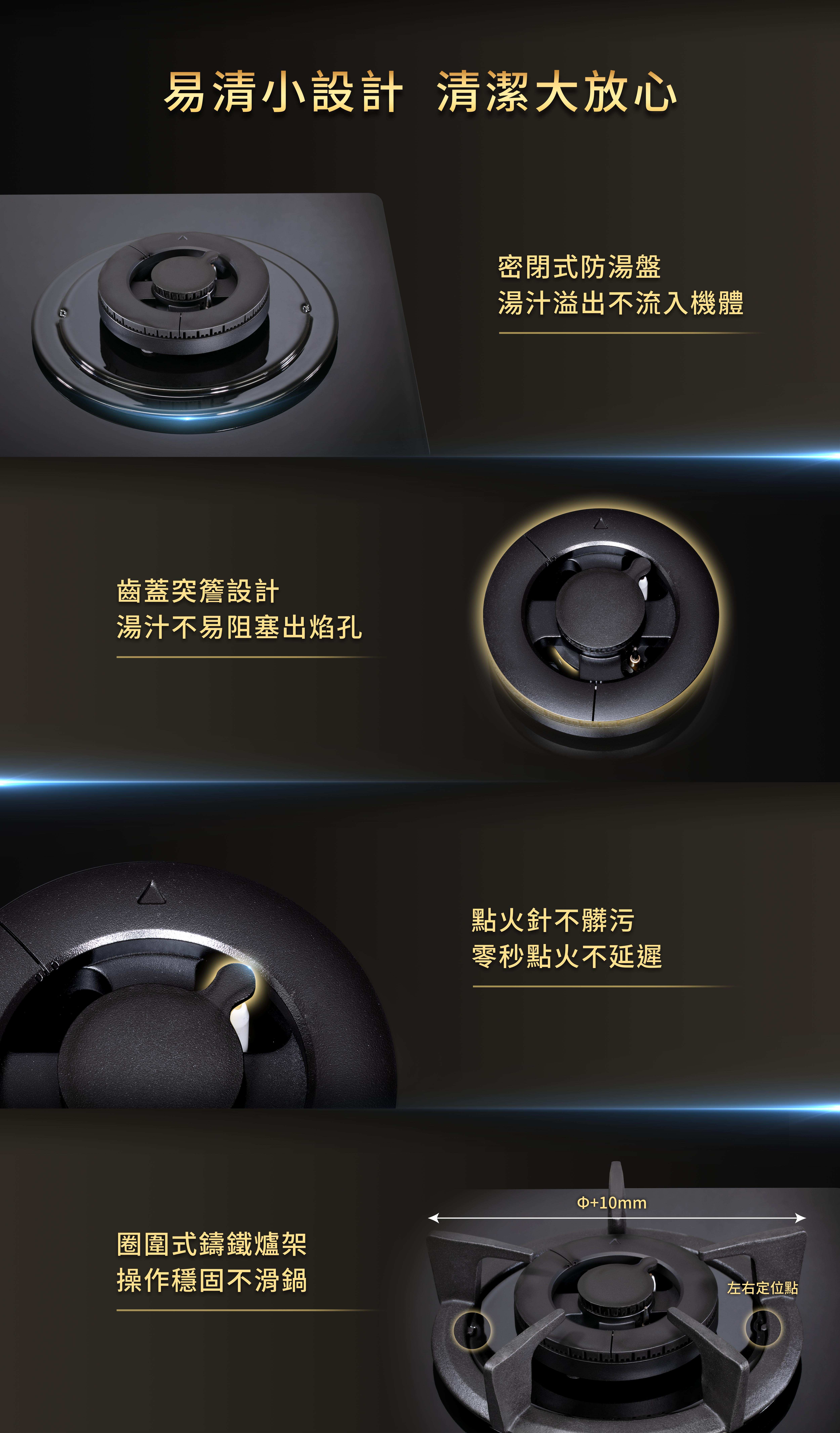 爐頭雙重凸簷設計,防止油漬髒污