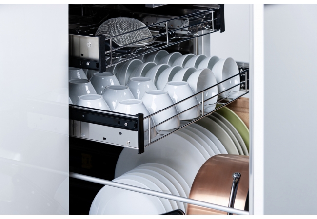 1. 上層放置碗、杯、筷,碗盤請依照籃架空間擺放,請勿上下相疊,會造成熱風吹不到無法烘乾。