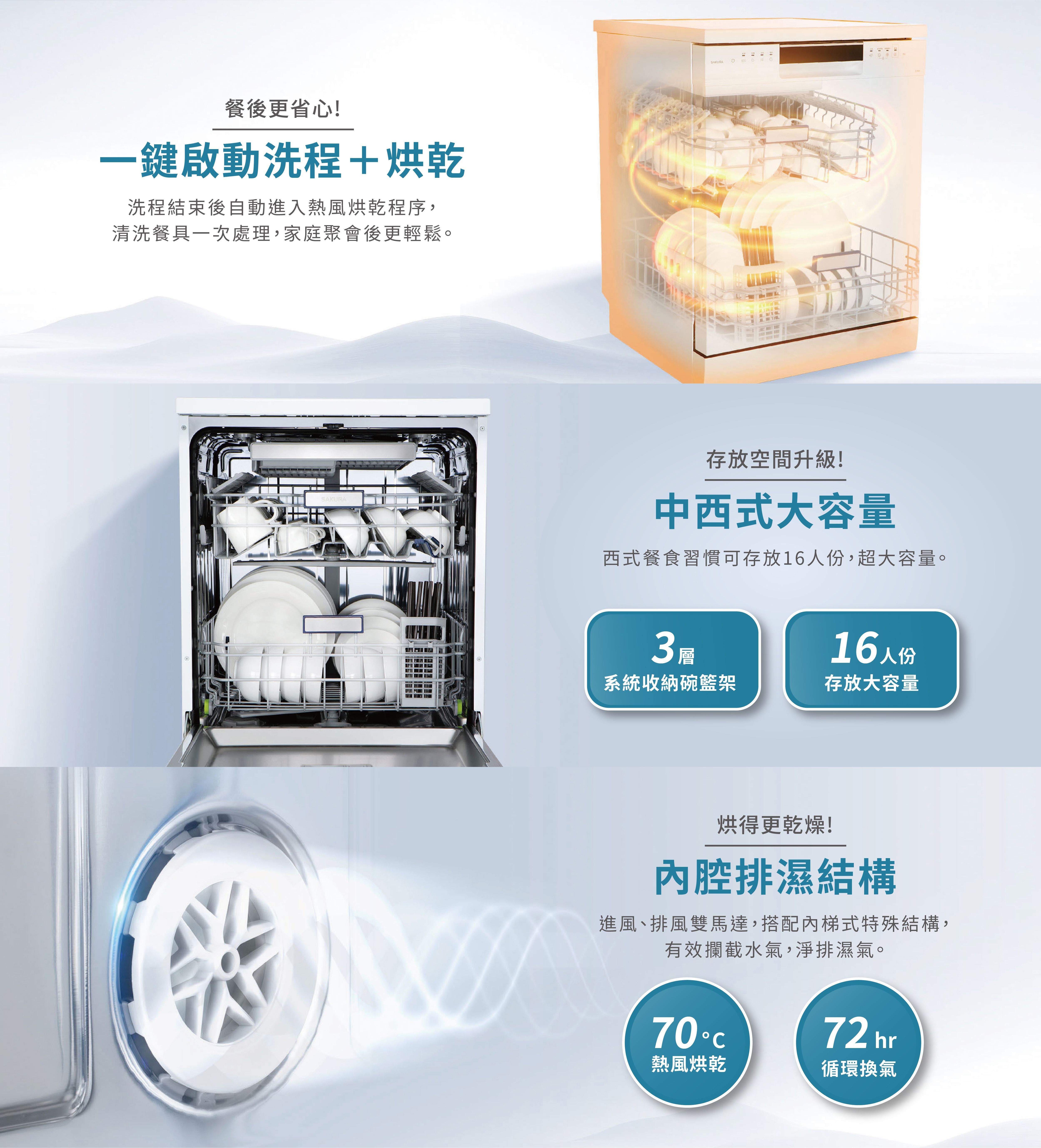 72小時熱風循環換氣,碗盤清新無異味