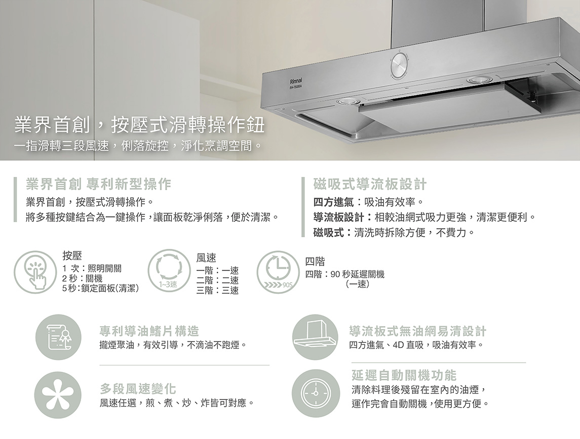 倒T式按壓滑轉設計排油煙機