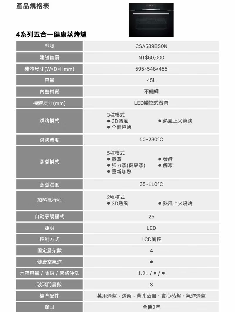 4系列 精巧型嵌入式蒸烤爐 60 x 45 cm 不銹鋼