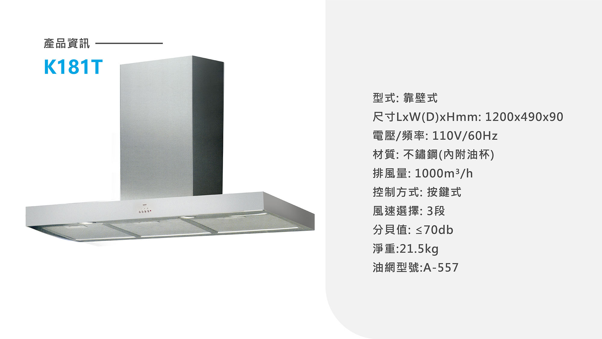 【限量】靠壁式倒T抽油煙機K181T(120cm)