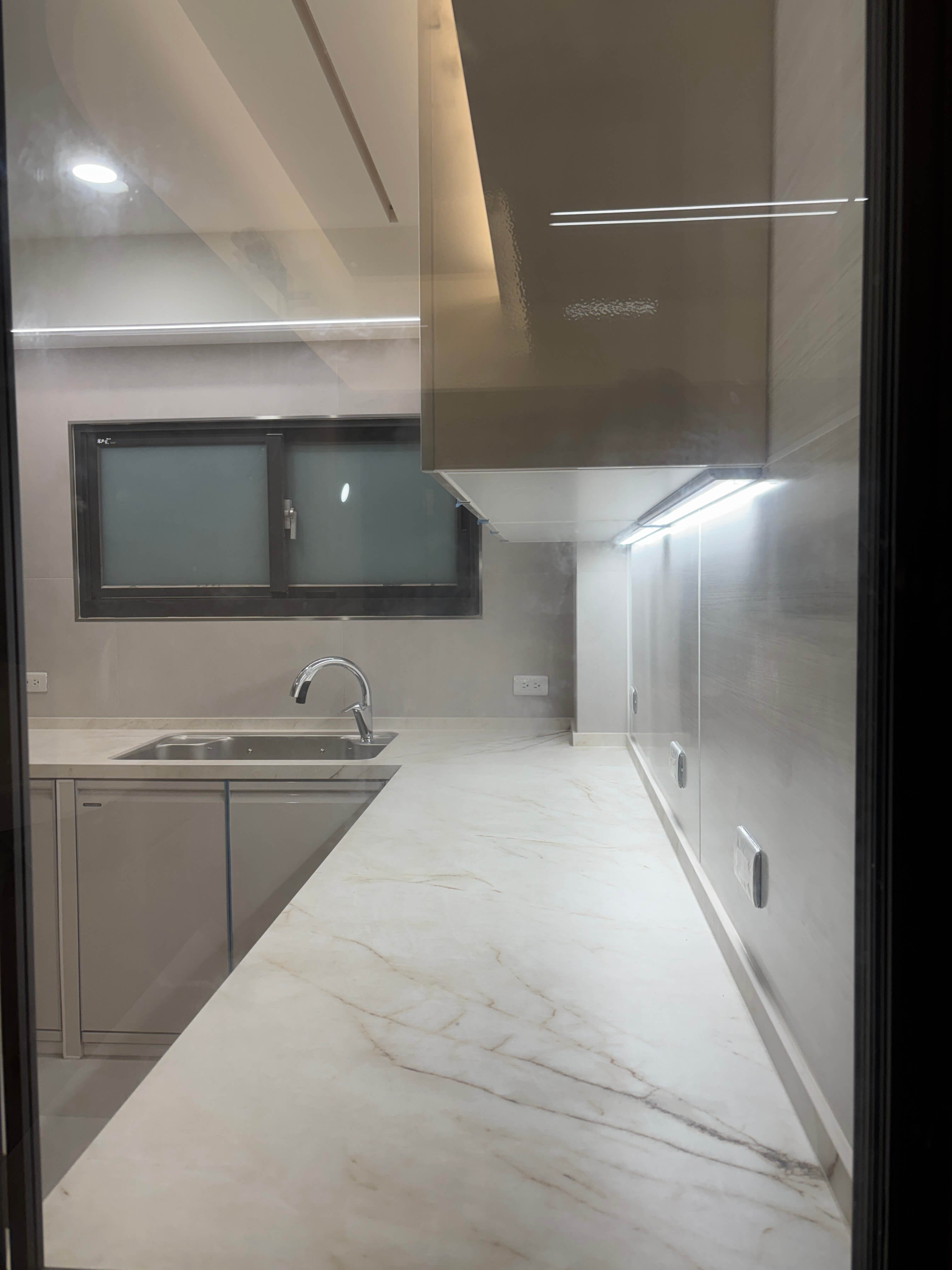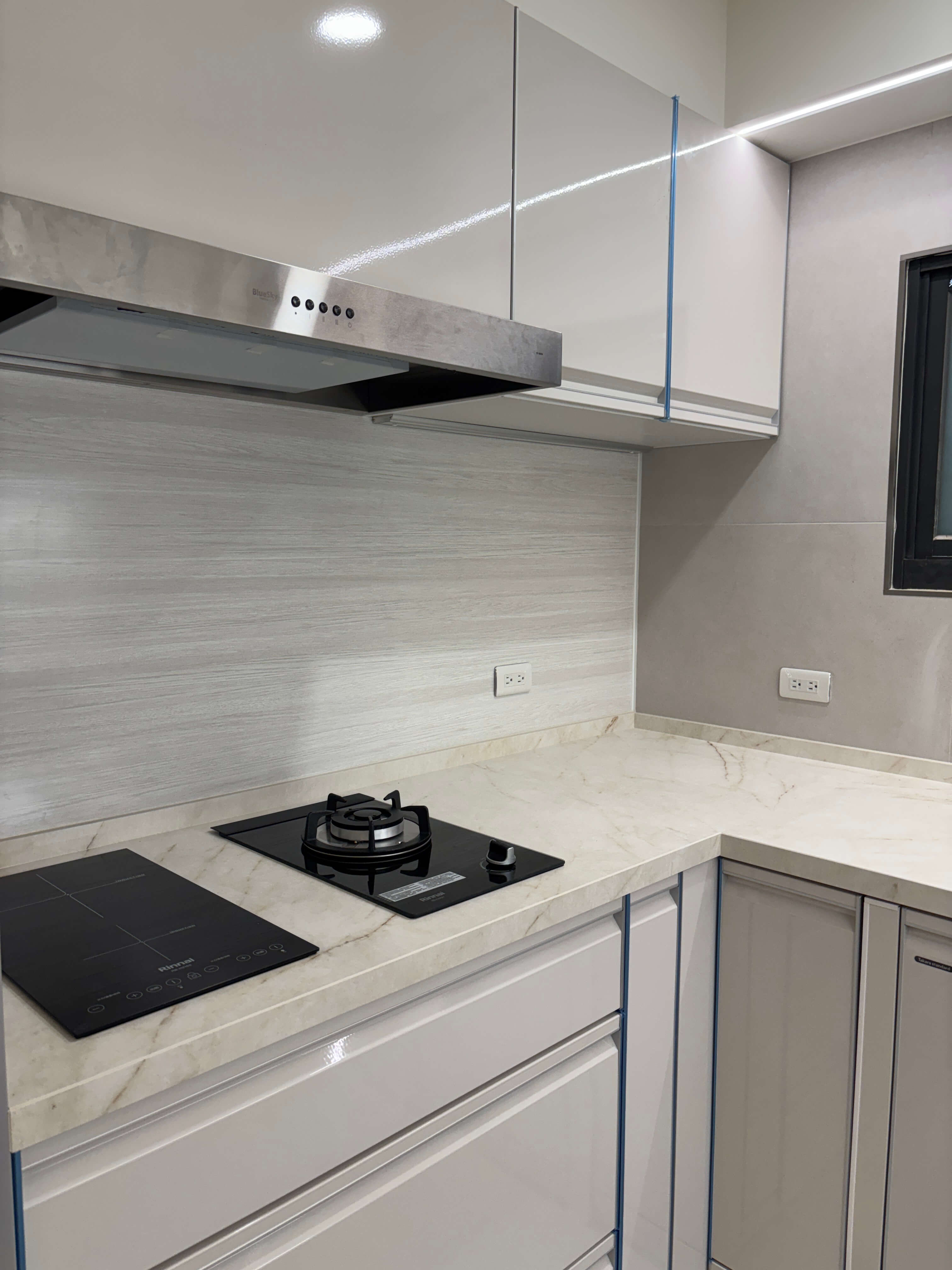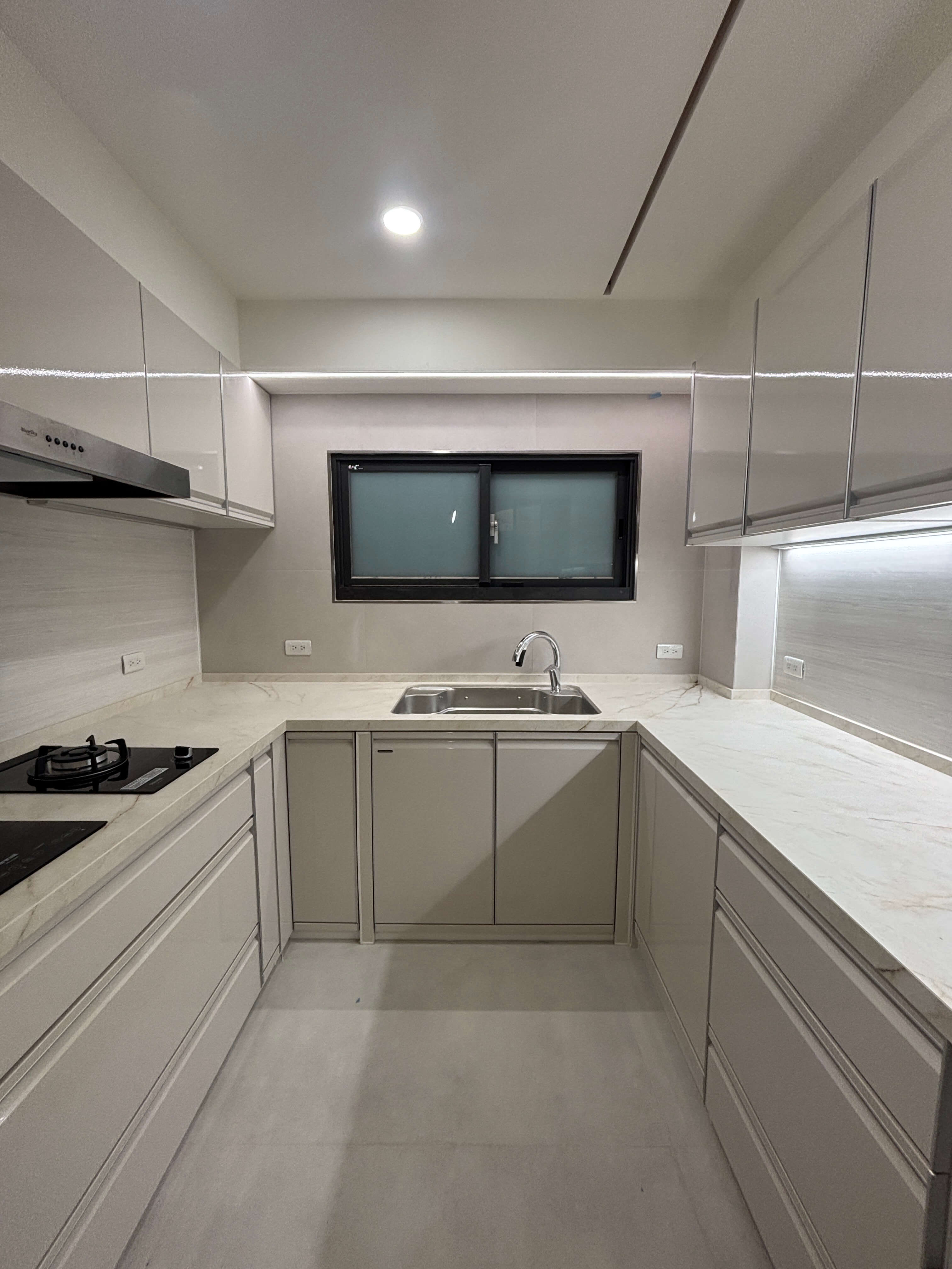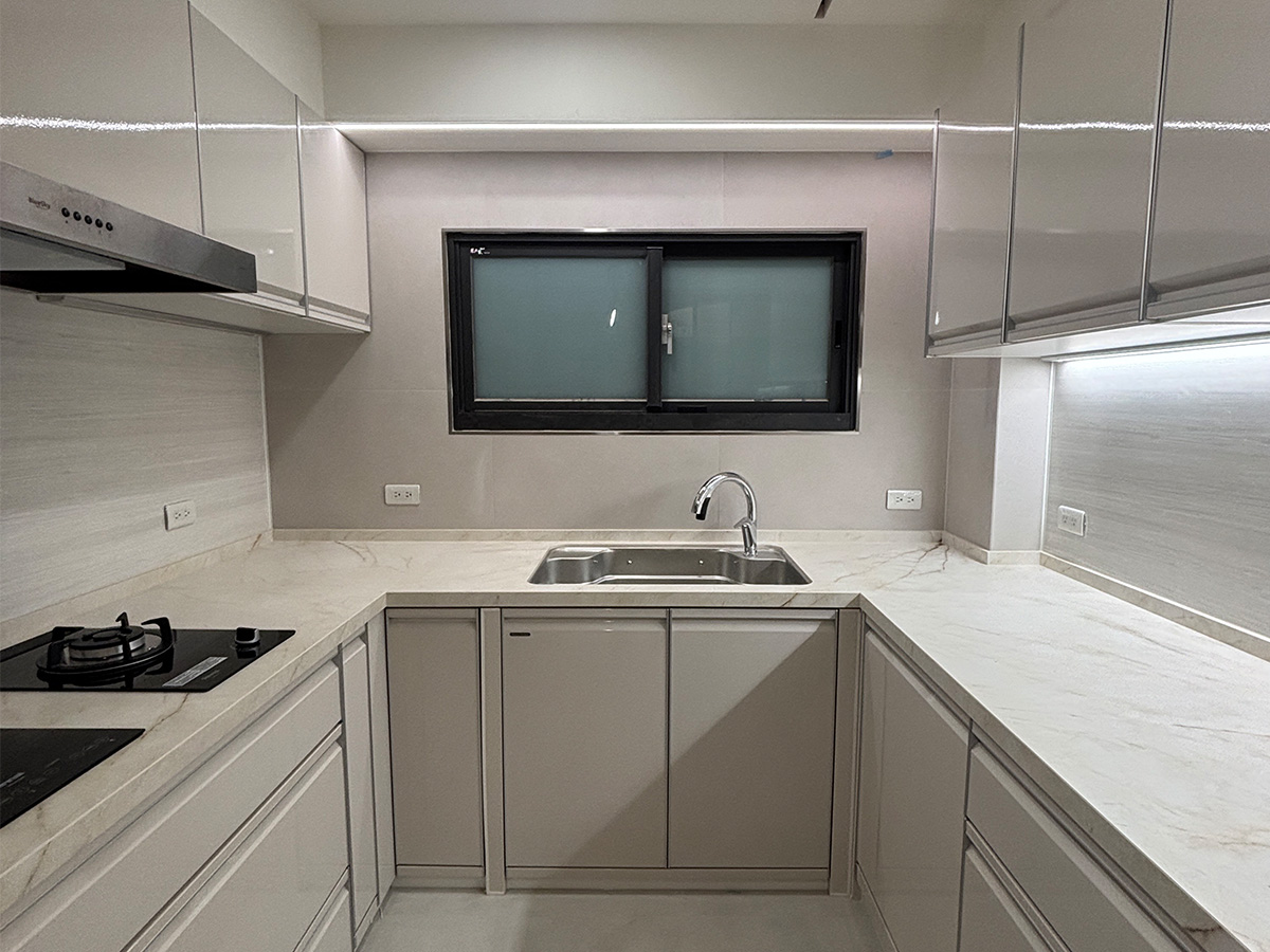 石英石枱面以柔白紋理承接日常操作,兼具耐用與從容美感;不鏽鋼水槽低調嵌入,俐落而精準,回應現代生活對效率與潔淨的期待。