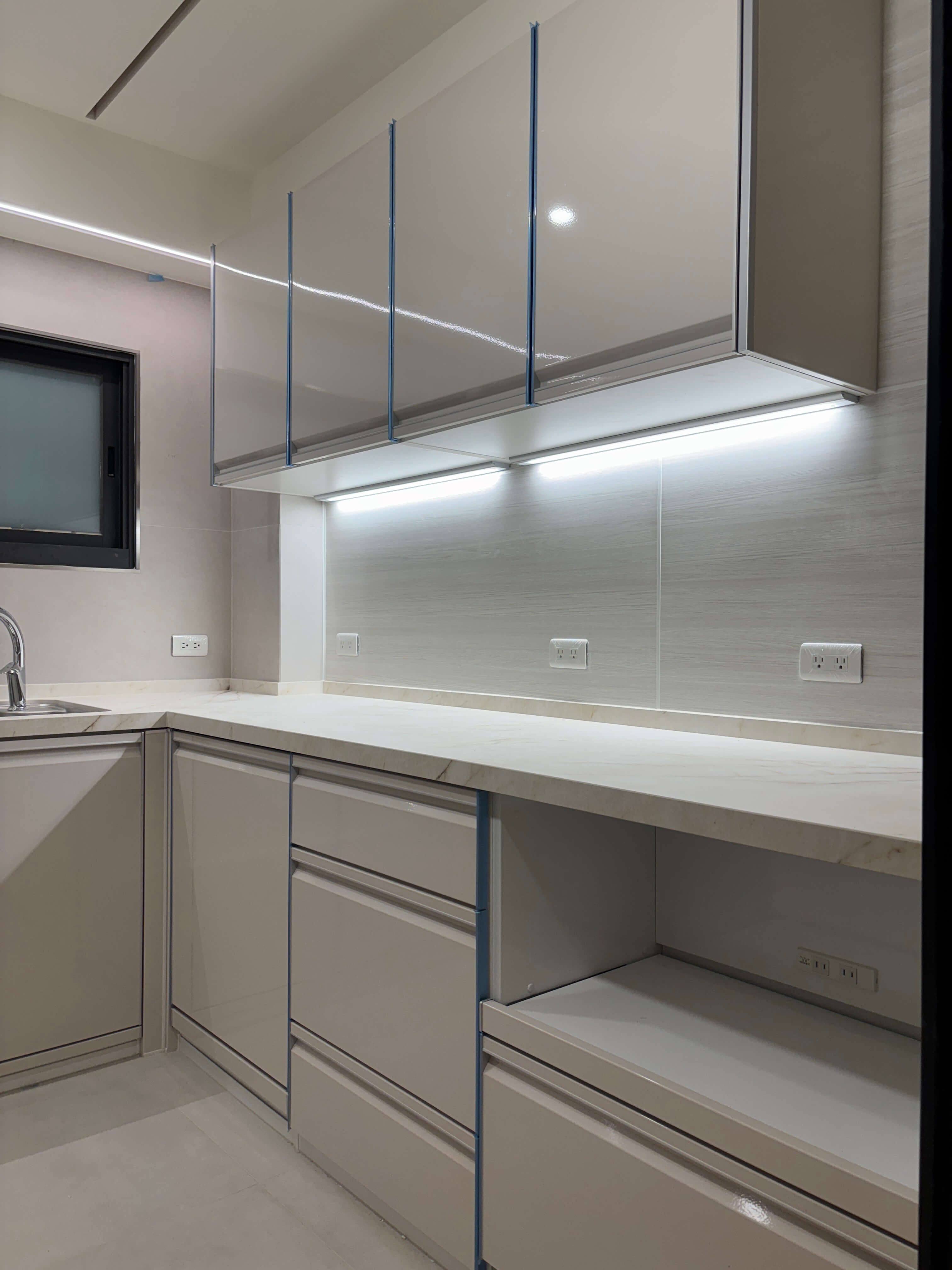 以 VSI 象牙色門板鋪陳空間基調,溫潤如光,細膩卻不張揚。隱藏式把手收起多餘線條,使立面回歸純粹,視覺在光影流動中自然延展。